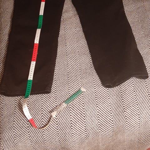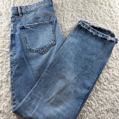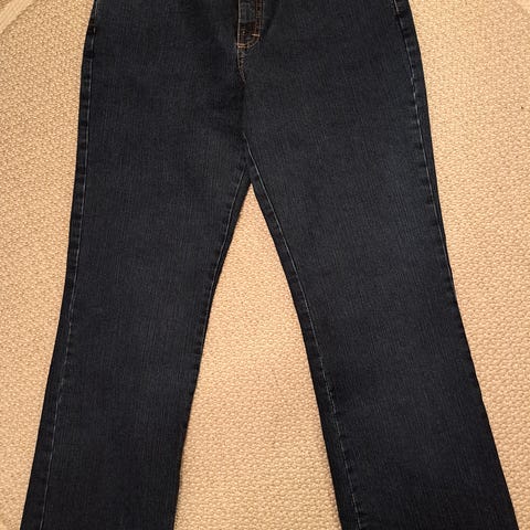 Tummansiniset farkut 46, vyörärön ympärys 100,5 cm. Pujotettava malli, ei vetoketjua. Valetaskut edessä. Takataskut löytyvät takaa. Lahkeet kapenee nilkkoja kohti. Materiaali puuvillaa 82 %, 16% elastaania ja 2 % polyesteriä.