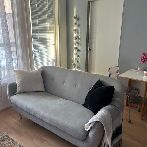 Ihan ok kunnossa oleva ikean sohva. Tosi pehmeä ja mukava istua :) Selkänoja heiluu hieman, mutta ei ole haitannut käytössä. Yhdessä jalassa on kolhu, mutta sekään ei ole haitannut. Päälliset voi ottaa irti ja pestä pesukoneessa ja aion ne pestä ennen myyntiä. Runkoon voi myös vaihtoehtoisesti ostaa uudet päälliset ikeasta. Myydään uuden sohvan tieltä :) sohvan leveys on n 179cm