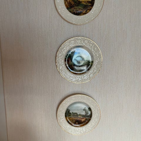 Kaksi seinälautasta vuodelta 1953, toisessa kuvattuna Taalintehtaan koulu ja toisessa opettajien asuintalo. Halkaisija 26 cm.