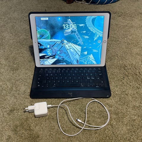 Ensimmäisen sukupolven iPad Pro. Ikää on mutta laite toimii edelleen hyvin. Kunto hyvä muutamaa lasin hiusnaarmua (näkyvät valossa, jos oikein tarkistelee), näytön yhtä pientä aavistuksen vaaleampaa laikkua ja pienen pientä painaumaa takakuoressa lukuunottamatta.