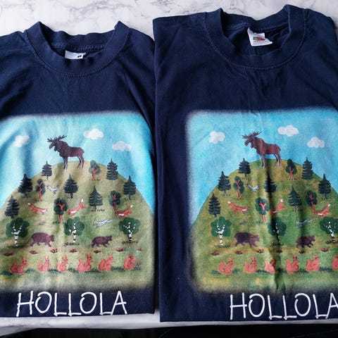 Painatus ei ole kulunut. Kuuluu olla näin. Paita ok kuntoinen.