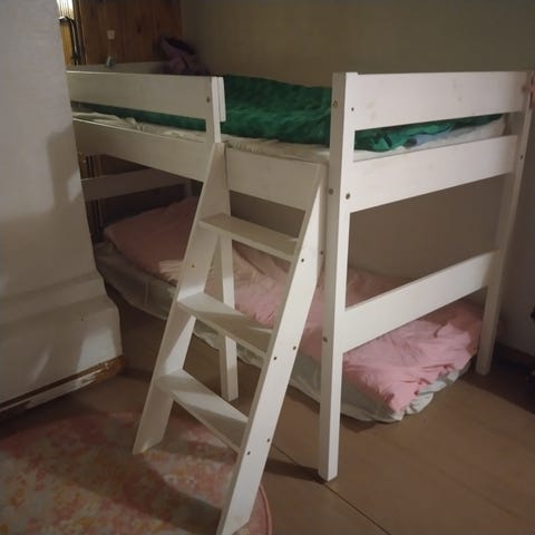 Siisti parvisänky, jossa työpöytä ja hyllyjä säilytystä varten. Väri valkoinen(hieman läpikuultava).
