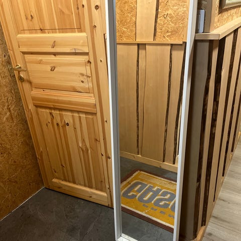 Hyväkuntoinen peili puisilla kehyksillä. Koko 122cm x 32cm.