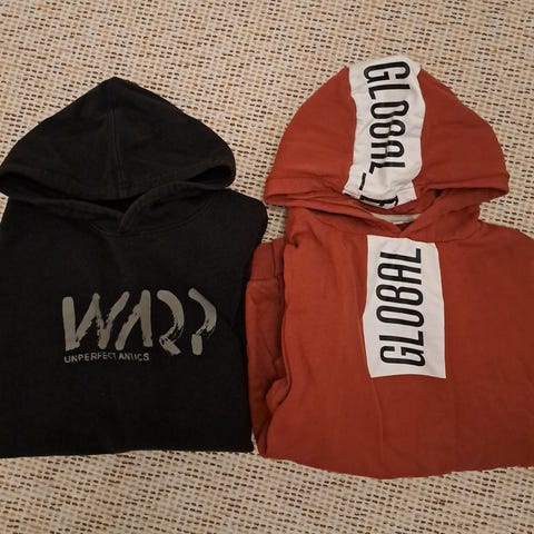 Ulkoiluhousut toisessa puntissa 1 reikä, musta Never out huppari, harmaa suorahihainen huppari, ohut harmaa pusero.