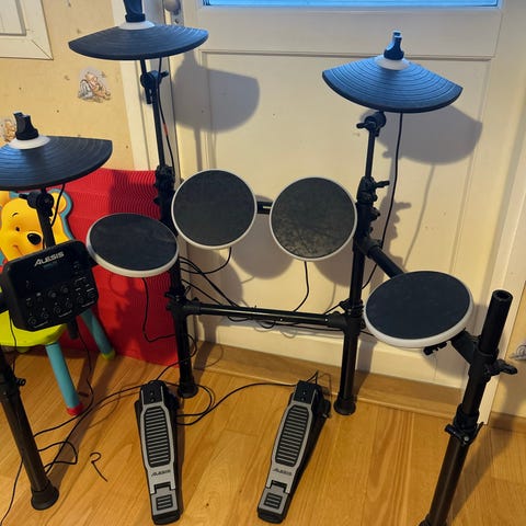 Alesis sähkörumpusetti, jossa useita rumpupadeja ja symbaalipadeja. Settiin kuuluu kahdet kapulat, ohjainmoduuli sekä kaksi jalkapoljinta. Väri musta. Malli on Alesis DM lite.