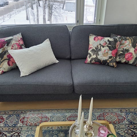 Kangaspäälliset ovat hyvässä kunnossa, ainoastaan istuintyynyjen reunoissa on pientä nyppääntymistä. Sohva on tukeva ja mukava istua, ja pitkäikäinen rakenne takaa käytön vuosiksi eteenpäin.