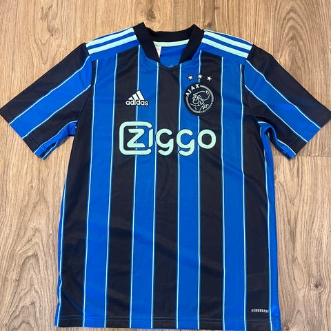 Adidas Ajax jalkapallopaita lapsille/nuorille. Koko 152-164 cm (12–14Y) valmistajan merkinnän mukaan. Sininen paita, jossa punaiset olkiraidat ja moniväriset resorit kauluksessa ja hihansuissa. Edessä Ajax-seuran logo, Adidas-logo ja Ziggo-painatus. Lyhythihainen malli, kevyt ja hengittävä materiaali jalkapalloon ja muuhun liikuntaan. Paidan pituus on 62cm ja leveys 47cm.