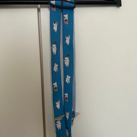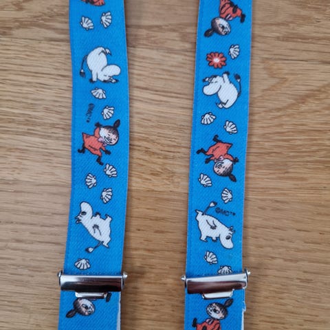 Erittäin siistit siniset lasten muumi henkselit. Y-malliset. Säädettävä pituus: lyhyimmillään 45cm, pisimmillään (mutta venyttämättä) 75cm.