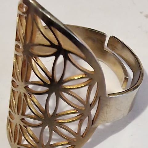Myydään upea, leveä ja yksityiskohtainen sormus, jossa on kaunis pitsimäinen kukkakuviointi. Sormus on koristeltu pienillä kirkkailla kristalleilla, jotka kimaltelevat kauniisti valossa.
