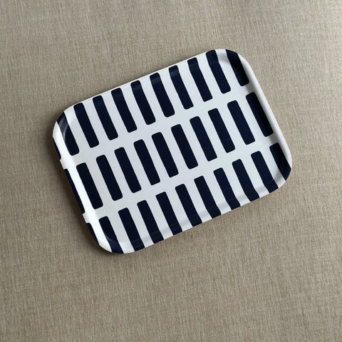 Tehdaspakkauksessa oleva Timo Sarpanevan suunnittelema More-tarjoilusetti. Tarjottimen koko n. 36 x 36 cm.