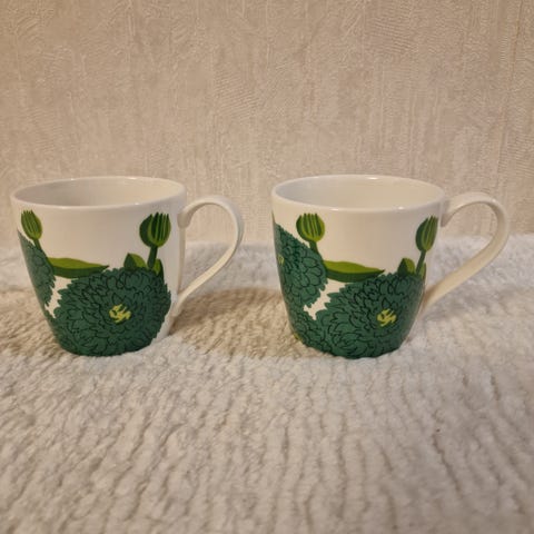 Vaaleanpunainen ja vaaleansininen Primavera-muki. Ulkopinnan värit hieman haalistuneet, mukien sisäpinta moitteeton. 8€/kpl, 15€/2kpl.