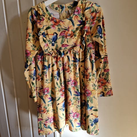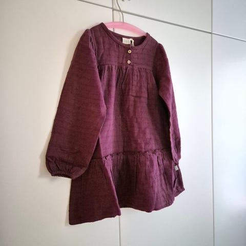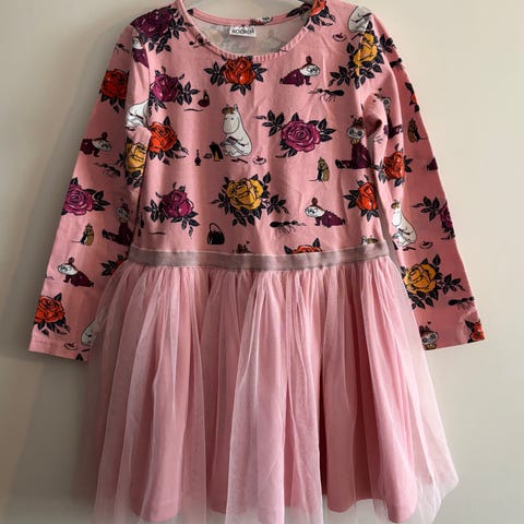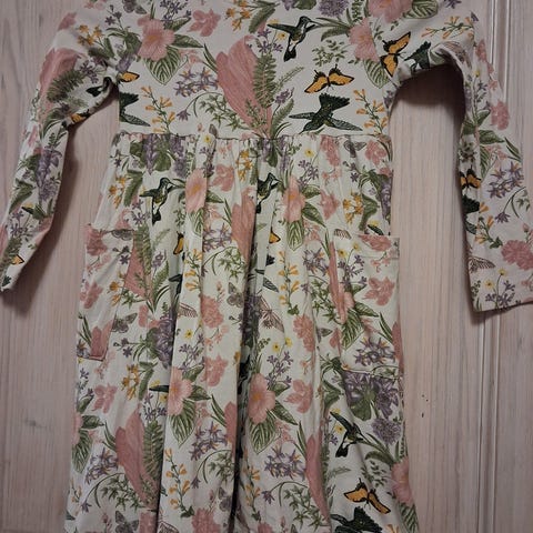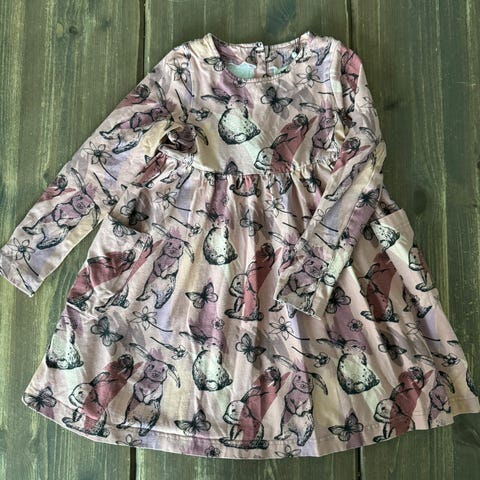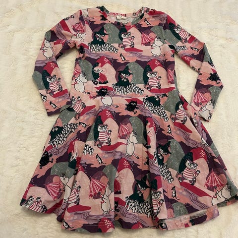 Ma-ia by Martinex mekko 110, takana napit, sivuilla taskut. Aivan ihana mekko, joka oli meidän tytön lemppari, käytössä 100-115-senttisellä, mielestäni silti erittäin hyvä kunto. Tässä on 5 % elastaania, minkä ansiosta on tosi miellyttävä päällä ja pysyy hyvännäköisenä pesusta toiseen.