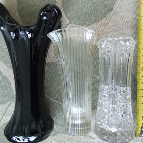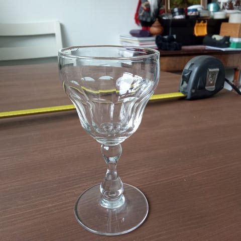 Kolme pientä vanha kotimaista viinilasia. Kaksi laseista on kirkasta lasia ja yksi sinistä lasia, kaikissa jalallinen malli. Laseissa on kaiverrettuja tai puristelasikuvioita. Korkeus mitan perusteella noin 12–13 cm. Sopivat esimerkiksi viinille, liköörille tai muille juomille sekä kattaukseen tai koristekäyttöön.