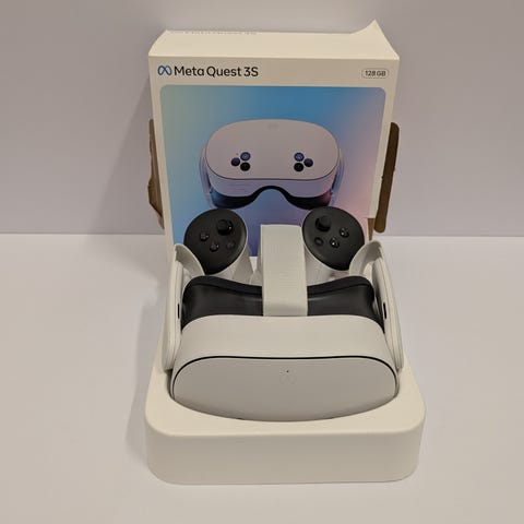 Mukana kypärä, vasen ja oikea ohjain, usb c latausjohto ja erittäin laadukas Metan oma suojakotelo.