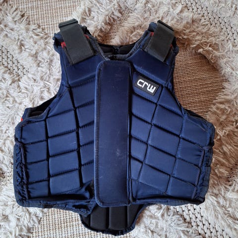 CRW ratsastussuojaliivi, väri musta. Koko 10, joka sopii tyypillisesti lapselle tai nuorelle ratsastajalle. Liivissä on pehmustetut paneelit edessä, sivuilla ja takana, jotka on jaettu osiin liikkumisen helpottamiseksi. Säädettävät kiinnitykset sivuilla auttavat istuvuuden säätämisessä. Soveltuu käytettäväksi ratsastuksessa lisäsuojana ylävartalolle. Ollut käytössä yhdellä 10vuotiaalla lapsella
