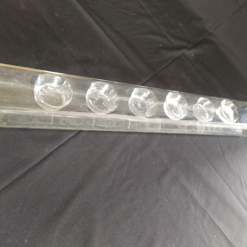 Myydään musta, metallinen 6 tuikkukynttilän teline. Tuikut sijoitetaan lasikippoihin ja ne roikkuvat kiskossa, mitä voi heiluttaa. Telineen mitat: leveys 57,5 cm, syvyys 10,5 cm, korkeus 18,5 cm.