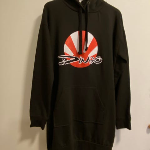 Harmaa pidempi mallinen huppari. Koko M, mutta reilu mielestäni.