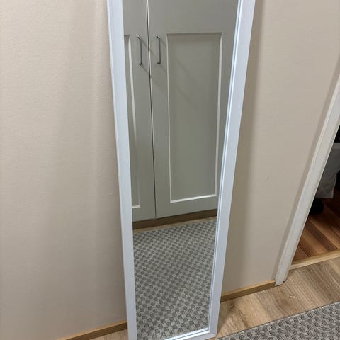 Jysk kokovartalopeili, jossa koristeellinen valkoinen kehys. Peili on pystymallinen ja sopii esimerkiksi makuuhuoneeseen tai eteiseen pukeutumis- ja sisustuspeiliksi. Koristeellinen kehys tuo klassista ilmettä sisustukseen. Peili voidaan asettaa nojaamaan seinää vasten tai kiinnittää seinälle kiinnitystavoista riippuen. Peilissä halkeama ja koristeeeunasta lähtenyt palanen. Ei kuitenkaan vaikuta käyttöön. Myyn nopeimmalle hakijalle.