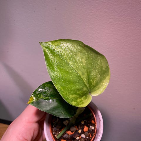 Kaunis pieni 2-lehtinen taimi Scindapsus Jade Satin Aureaa, jonka uusi lehti on todella kaunis! ❤️