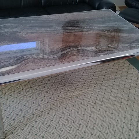Pöydässä puinen runko, sekä alahylly/lehtitaso. Pöytälevy painaa aivan älyttömästi. Pöydän leveys on 108cm, syvyys 53cm ja korkeus 44cm.