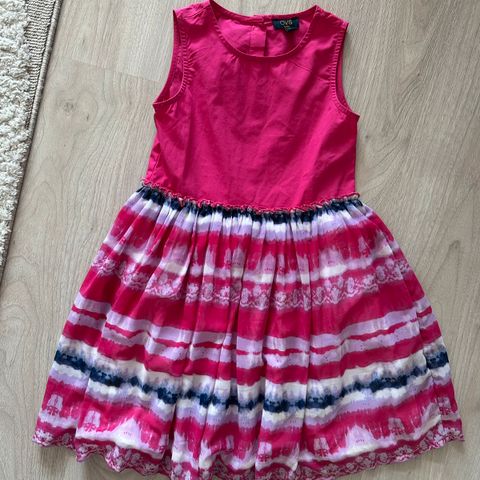 Myydään kaunis Oliver-merkin mekko koossa 134. Mekko on pitkä, etuosassa muutama nappi helpottamassa pukemista, mutta mekko ei kuitenkaan "aukea" alas asti. Hihansuissa joustavat kuminauhat. Ei taskuja.