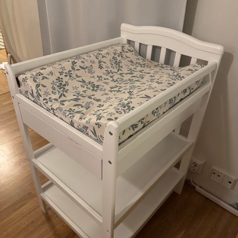 Ostettu uutena Jollyroomista keväällä 2025. Lyhennetty jalkoja alkuperäisestä, nyt hoitopöydän tason korkeus lattiasta 86cm. Alkuperäinen korkeus ollut 96cm.
