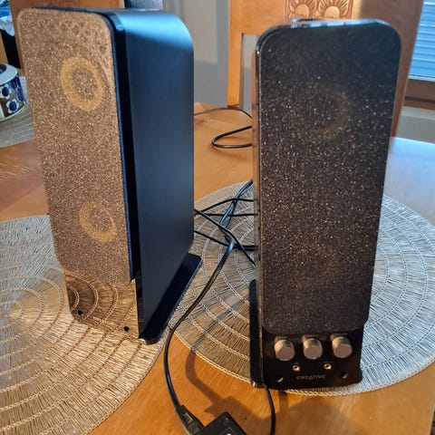 Iäkkäät mutta laadukkaat aktiivikaiuttimet vaikkapa tietokoneen äänentoistoksi. Mukaan kaikki tarvittavat kaapelit.