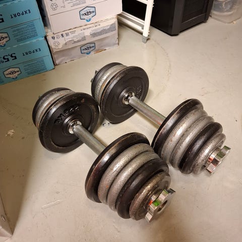 Myydään säädettävät käsipainot, yhteensä 49 kg. Paketissa alla olevan listan mukainen määrä levypainoja yhteensä 44 kg edestä, 4:t kahvat, 6 kiristysrengasta ja kaksi kuljetussalkkua. 5 kg painot eivät mahdu salkkuun, mutta kulkeutuvat kätevästi kahvoissa.