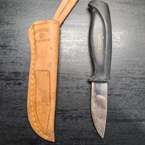 Kota center logo tupessa, puukossa ei kaiverruksia tai valmistajan merkintöjä. Puukon pituus noin 21.3cm, terän noin 10.3cm.