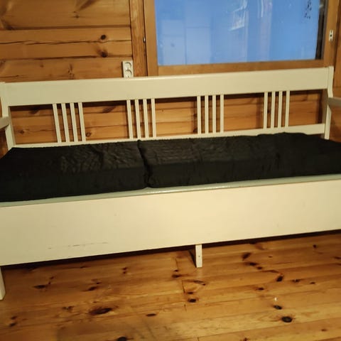 Sivustavedettävä levitettävä puusohva. Leveys n. 60 cm. Pituus n. 190 cm. Katso myös saman värinen päästävedettävä lasten sänky omana ilmoituksena.
