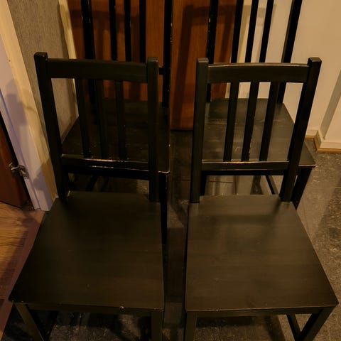 Annetaan muuton tieltä 3 valkoista tuolia metallisilla jaloilla. Käytössä olleet lähes 20 vuotta, joten pientä käytön jälkeä näkyy etenkin tuolin karmeissa.