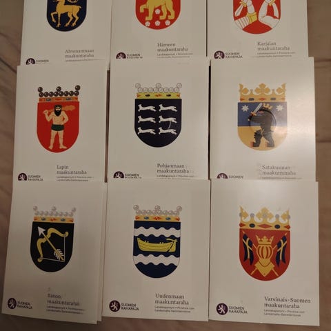 Suomen Rahapajan maakuntiensarjan 5 euron proof erikoisrahoja, yhteensä 9 kappaletta. Kolikot on pakattu alkuperäisiin pahvisiin pakkauksiin, joissa on kohteiden kuvaus ja tekniset tiedot .