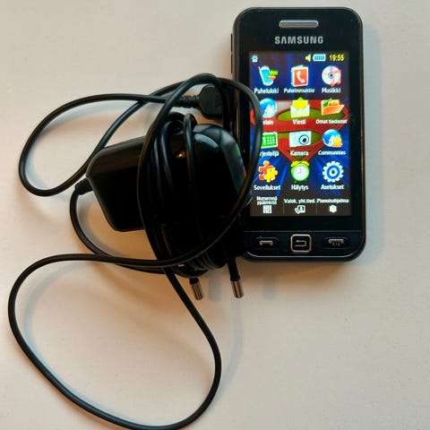Samsung Galaxy S -älypuhelin musta. Puhelimessa on kosketusnäyttö, etupuolella fyysiset painikkeet ja takana kamera salamalla. Rungon muotoilu on kulmista vahvistettu ja takakuori on tummanvärinen, uritettu muovipinta. Sopii peruskäyttöön, kuten puheluihin, viesteihin ja yksinkertaiseen sovellusten käyttöön.