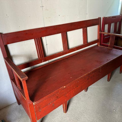 Vanha puusohva saranoidulla kannella. Leveys noin 60 cm. Pituus noin 190 cm.