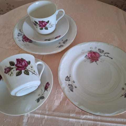 Kaunis ruusukuvioitu kahviastiasto. Kevyet ja romanttiset kupit. Ruusukuvio myös lautasissa.