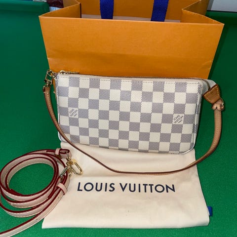 Tosi hyvässä kunnossa Louis Vuitton pochette Accessories, ulkopuolelta oikein siisti ja sisäpuoli on puhdas. Vetoketju vedin hieman haalistunut mutta toimii hyvin. Mukana tulee kolme laukun hihnaa ja myös aitoustodistus. Datecode VI1010