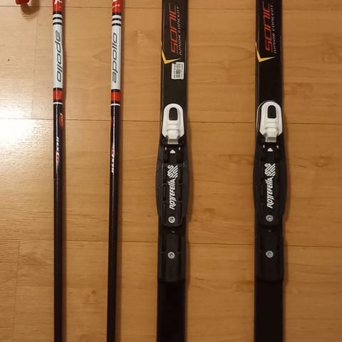 Kouluhiihdossa käytetty setti. Monot tosi hyvässä kunnossa. Sukset ja sauvat enemmän käytetyt mutta hyvin toimivat.