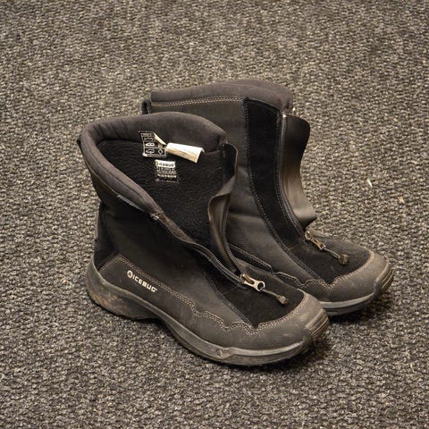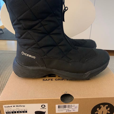 Icebug Ivalo2 W BUGrip talvikengät, koko 41. Mustat nilkkapituiset talvikengät, joissa vetoketju edessä. Pohjassa BUGrip-nastat, jotka parantavat pitoa liukkaalla alustalla. Päällinen tekstiili- ja synteettistä materiaalia, sisäpuoli pehmeä ja lämmin. Kengät on suunniteltu talvikäyttöön ja tarjoavat tuen ja pidon kävelyyn lumessa ja jäällä.