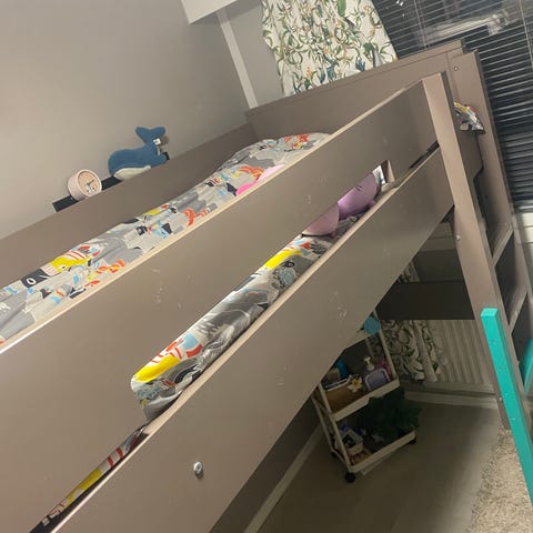 Itse tehty valkoinen parvisänky puusta leikkimökkiin vuonna 2016, ei mahdu ovesta kokonaan, johtuu purkamaan. Taakse voi tehdä kaiteet halutessaan. Tätä voi myös muokata.