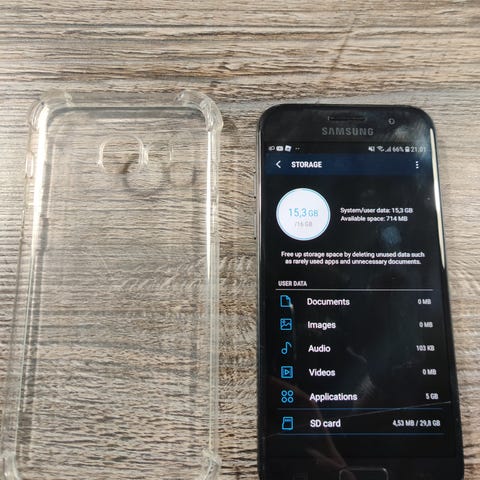 Myynnissä Samsung A3 matkapuhelin. Muisti tyhjennetty. Näytössä halkeama (näkyy kuvassa), joka ei vaikuta puhelimen käyttöön. Mukana Studio Ghiblin puhelinkuori.