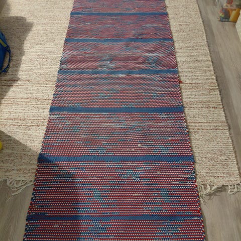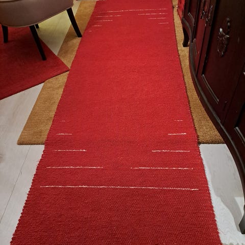 Räsymatto, jossa päävärinä beige ja suorissa raidoissa punaisia ja vihreitä korostuksia. Sopii käytettäväksi esimerkiksi eteisessä, käytävässä tai keittiössä. Matto on kapea ja pitkä, ja sen päät on viimeistelty hapsuilla.
