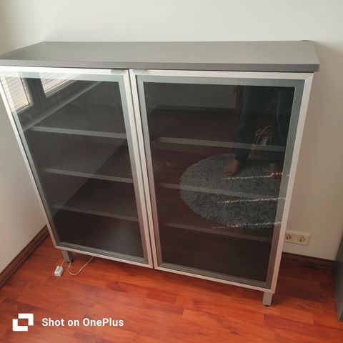 Yhdessä lasipaneelissa on pieni halkeama, joka on teipattu. Halkeama ei ole edennyt, ja kaappia on käytetty normaalisti tavaroiden kanssa ilman ongelmia.