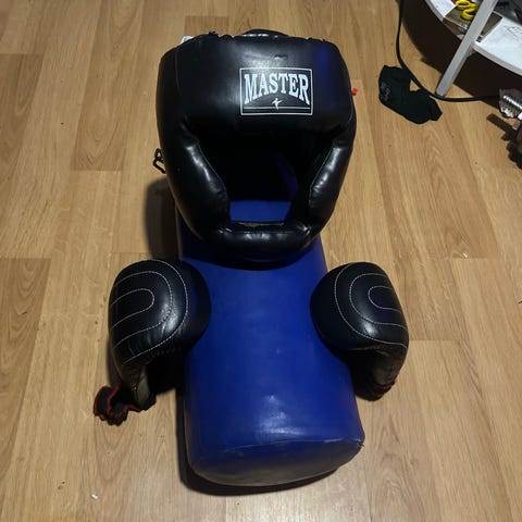 Master nyrkkeilysarja säkki, pääsuoja ja Duke-iskutyynyt musta/sininen