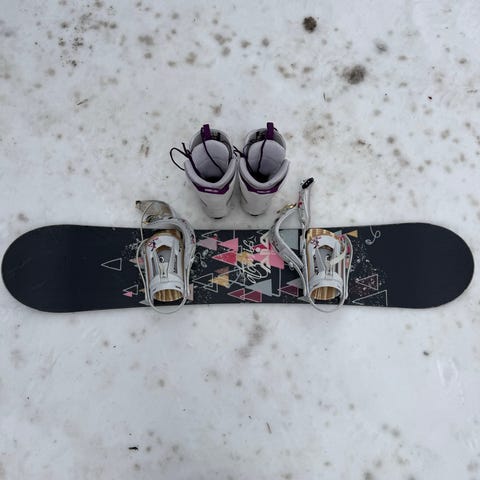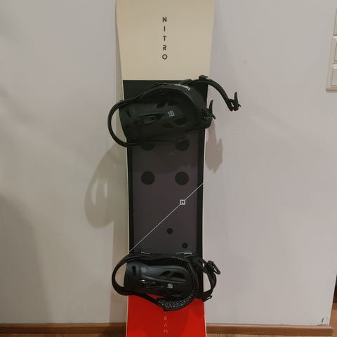 Hyvässä kunnossa oleva Nitro Mini Thrills 142cm lumilauta ja Nitro Charger siteet.