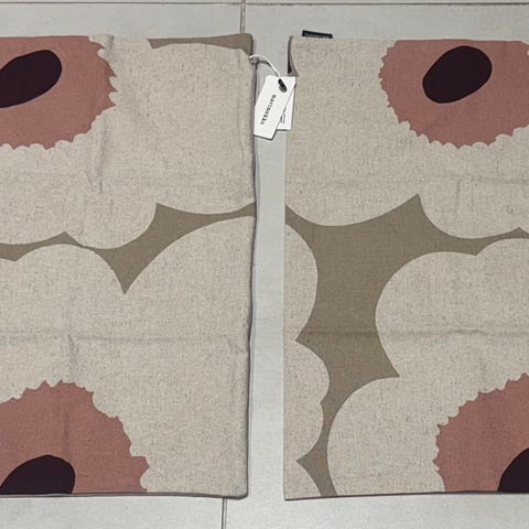 Unikko kankaasta ommeltu tyynynpäälliset. Kauniin keväisen hempeät värit. Pohjaväri hento vaaleanpunainen. Uudet käyttämättömät ja vetoketjulliset. Hinta KAPPALE 20 €