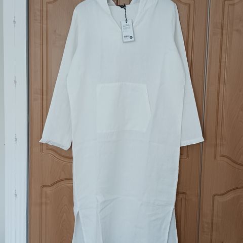 Myydään Nanson valkoinen hupparimekko, koko XL, tuotetta ei ole käytetty kertaakaan, roikkunut vain kaapissa. Materiaalina pellava.