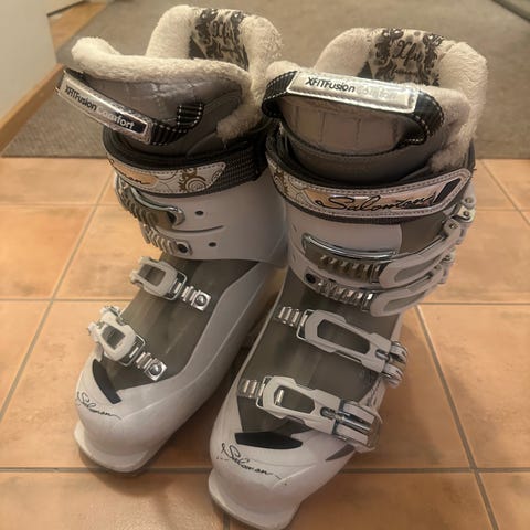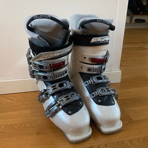 Salomon Verse naisten laskettelumonot. Mondo koko 24.5 cm, joka vastaa noin 38 - 39 EU kokoa. Monoissa on muovishelli, pehmustettu sisäkenkä sekä säädettävät soljet ja tarrakiinnitys varren ympärillä. Takana on kävely-/ajoasennon säätövipu. Pohjassa on uritettu kumipohja siteisiin sopivalla rakenteella. Soveltuvat rinnelasketteluun aloittelijalle tai harrastajalle.