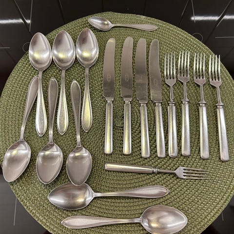 Sorakoski aterinsetti. Settiin kuuluu useita haarukoita ja veitsiä, joissa on sama koristeellinen Sorakoski-malli. Aterimet ovat metallia ja niissä on yhtenäinen klassinen muotoilu. Sopii kattaukseen esimerkiksi jälkiruoka- tai kala-aterimiksi. Merkkaukset näkyvät varressa: