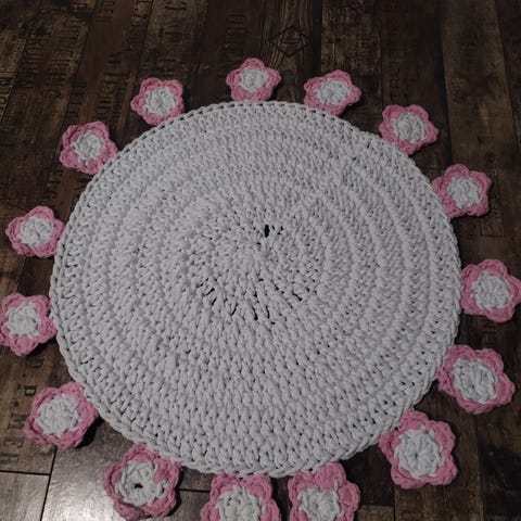 Myynnissä uusi käsityönä virkattu kohokuviollinen matto. Valmistettu luonnonvalkoisesta ontelokuteesta (80% puuvillaa, 20% kierrätyspolyesteriä).