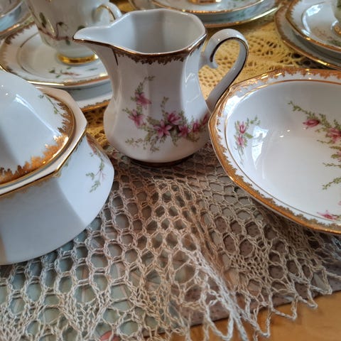 Siisti ja hyväkuntoinen, ruusukukka posliini kahviastiasto tarpeettomana!
